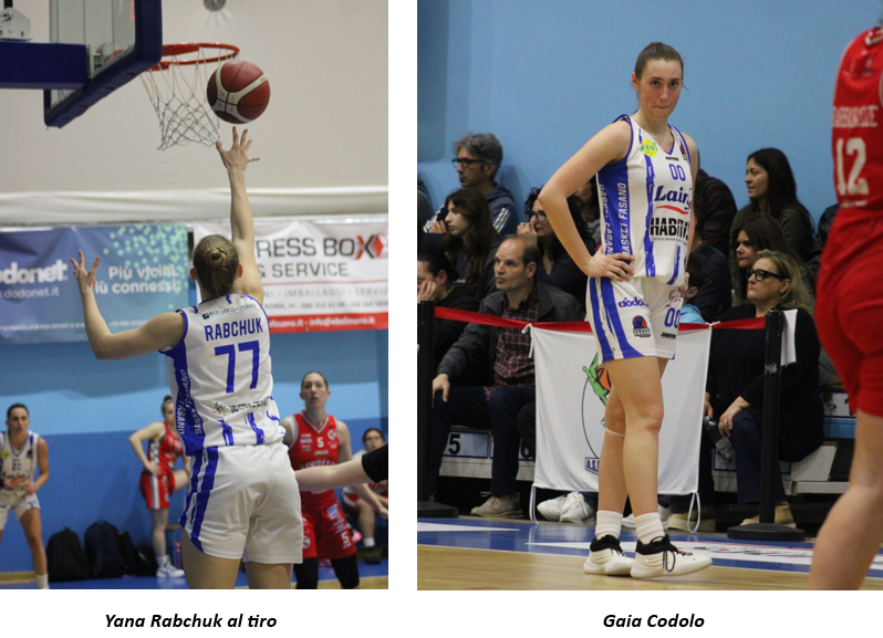 Per Fasano ottime Ferraretti con 21 punti (più 4 rimbalzi e 5 recuperate), poi Rabchuk in doppia doppia con 19 punti e 13 rimbalzi, ma anche 5 recuperate, 3 stoppate e un bel bernoccolo sulla fronte. Ottimo contributo per Lucchesini e Giuranna con 10 punti a testa, poi Vitali e Codolo entrambe con 8 punti, per il centro udinese anche 11 rimbalzi, 3 recuperate e 2 stoppate. Per le ospiti su tutti Barbakadze, top scorer con 27 punti, poi Orchi con 12 e Pragliola con 9